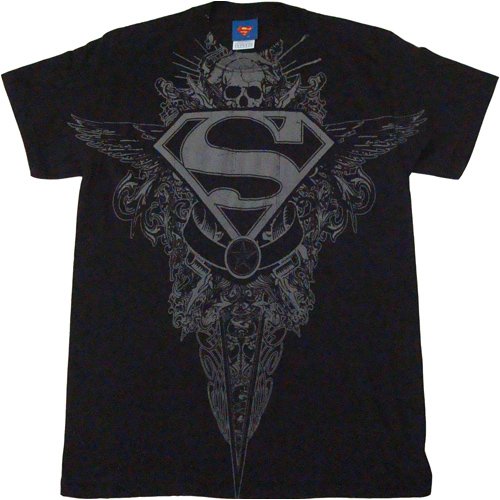 This cool Superman shirt features a front print of the classic Superman shield logo - in a totally new light. The entire print is distressed gray-on-black, and includes a prominent Superman emblem, with a skull and heraldic design in the background. Because it is distressed the print will include some irregularities - this is an intentional part of the shirts design and should not be considered a flaw in the product. Standard mens size tee. Shoulder-to-shoulder taped, sleeve and bottom hem are double-needled. 100% cotton. Officially licensed.